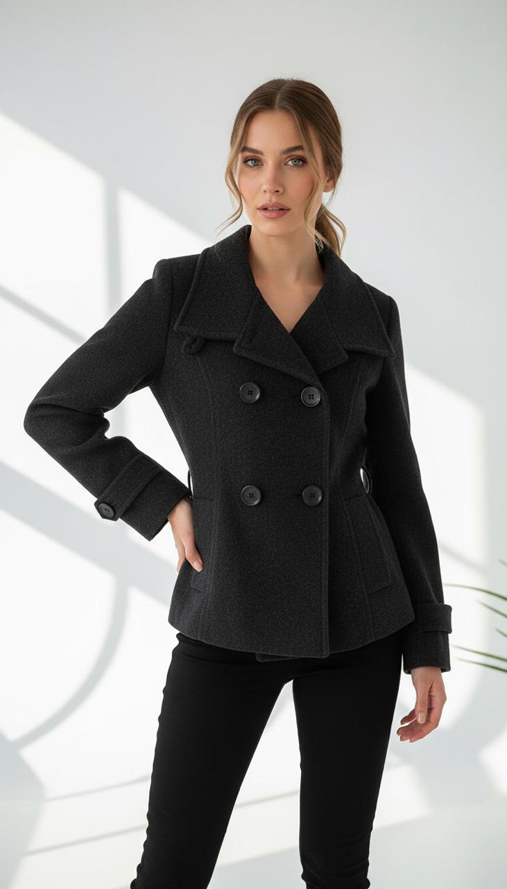 Esse blazer feminino em lã batida preta é uma peça clássica, sofisticada e atemporal. Com modelagem estruturada, possui gola ampla, fechamento frontal transpassado com botões duplos e bolsos funcionais. Os detalhes nos punhos com abotoamento acrescentam charme extra à peça.